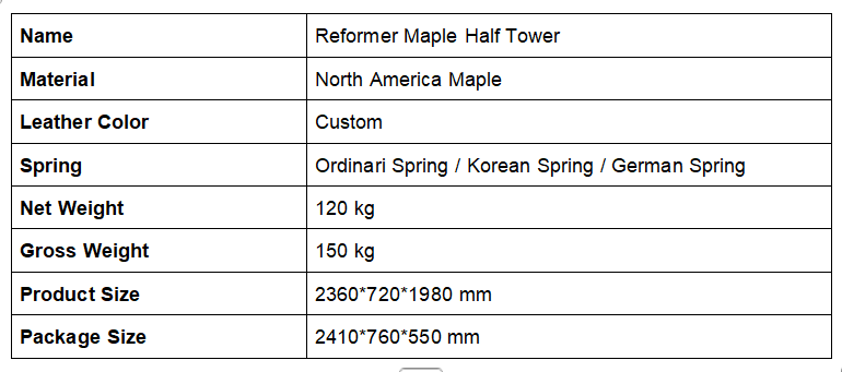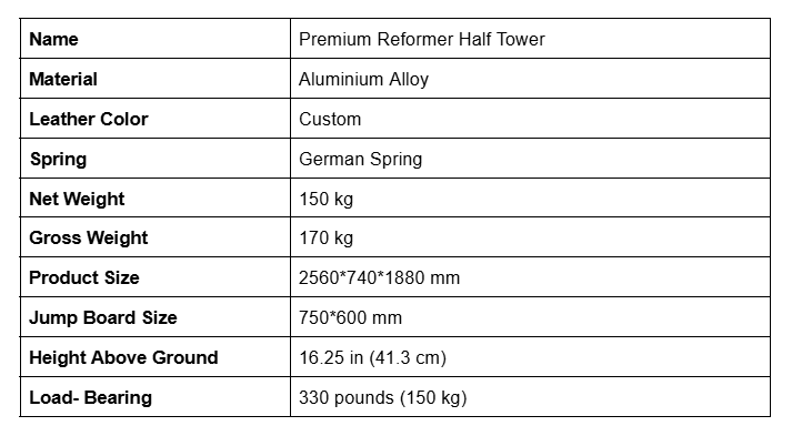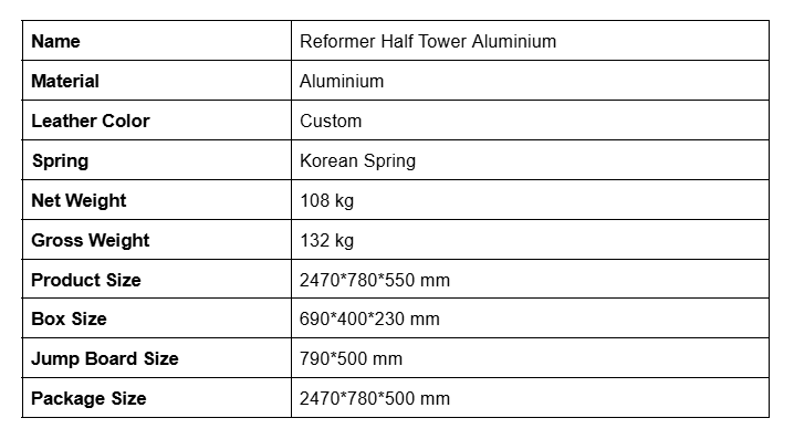 A flexible exercise system combining the reformer with a carriage, a tower, and a stable mat. Made of powder coated aluminium frame with 3-position head rest. Frame thickness 3cm. Stainless Steel metals are durable, It provides an opportunity for comprehensive Pilates training and rehabilitation.